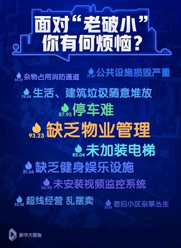 新華大數(shù)據(jù)顯示,與“老破小”相關的話題中,“缺乏物業(yè)管理”、“停車難”“未加裝電梯”等問題被提及次數(shù)最多,話題熱度分別達93.23、87.93和85.04。