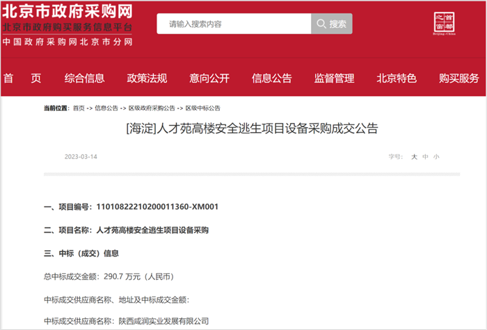 咸潤自主研發的“高樓應急安全逃生智聯系統”以單一來源采購中標北京市海淀區人才苑高樓安全逃生項目設備采購項目。這是我司近期的一項重要成果,也是我們在高層建筑安全領域的又一次重要實踐!