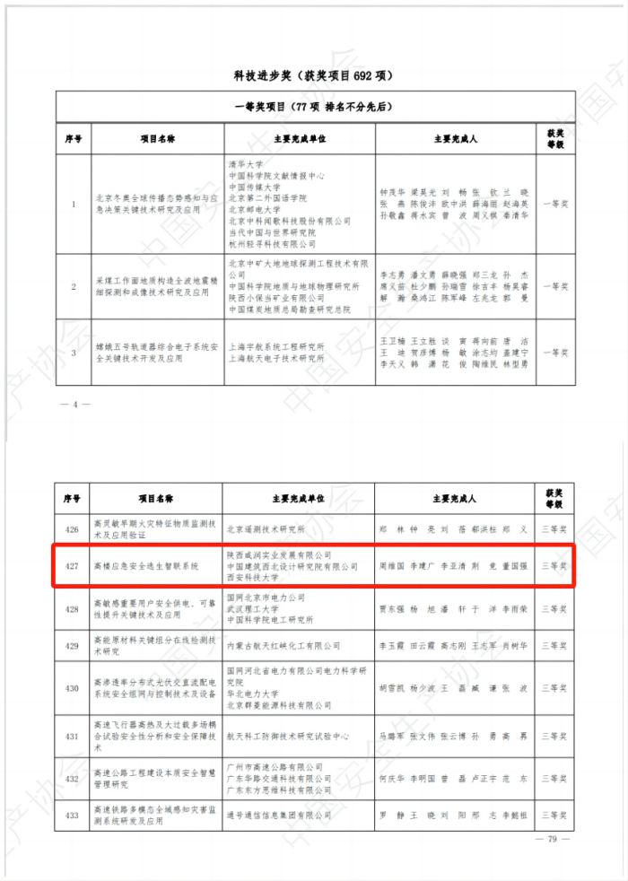 目前項(xiàng)目已累計(jì)申請(qǐng)國(guó)家專利51項(xiàng)(發(fā)明專利4項(xiàng)、實(shí)用新型專利34項(xiàng)、外觀設(shè)計(jì)專利13項(xiàng))、計(jì)算機(jī)軟件著作權(quán)3項(xiàng),先后入選陜西科技創(chuàng)新優(yōu)秀案例(列入優(yōu)秀案例合集)、西咸新區(qū)科技計(jì)劃社會(huì)發(fā)展類項(xiàng)目,連續(xù)2年被納入西安市應(yīng)急管理科技創(chuàng)新重點(diǎn)工作任務(wù),以該項(xiàng)目為基礎(chǔ)的2項(xiàng)地方標(biāo)準(zhǔn)《高層建筑緊急逃生設(shè)施應(yīng)用技術(shù)規(guī)程》和《高層建筑緊急逃生固定設(shè)施構(gòu)造圖集》在陜西省住房和城鄉(xiāng)建設(shè)廳完成立項(xiàng)審批。經(jīng)陜西省科學(xué)技術(shù)廳組織技術(shù)鑒定,成果評(píng)價(jià)為“國(guó)際領(lǐng)先”水平、填補(bǔ)行業(yè)空白。