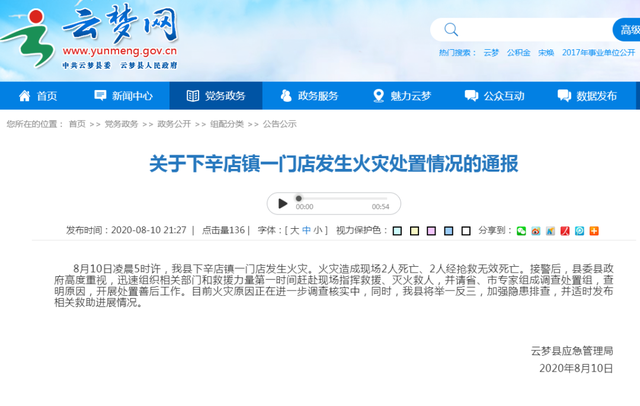 案例四:8月10日凌晨5時許,湖北云夢縣一門店發生火災?;馂脑斐涩F場2人死亡、2人送醫經搶救無效死亡。