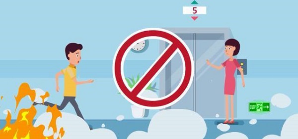 2.千萬別坐電梯。因為火場煙氣涌入電梯通道形成煙囪效應,電梯里的人會被濃煙毒氣熏死。