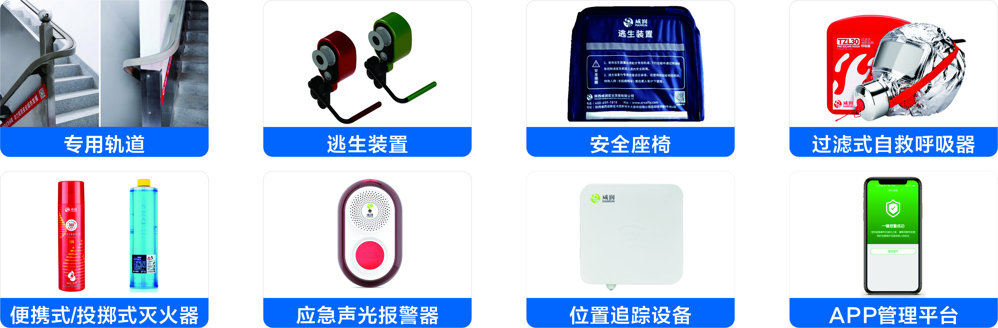 ·逃生設(shè)施的核心產(chǎn)品由專用軌道、逃生裝置、過濾式自救呼吸器組成。